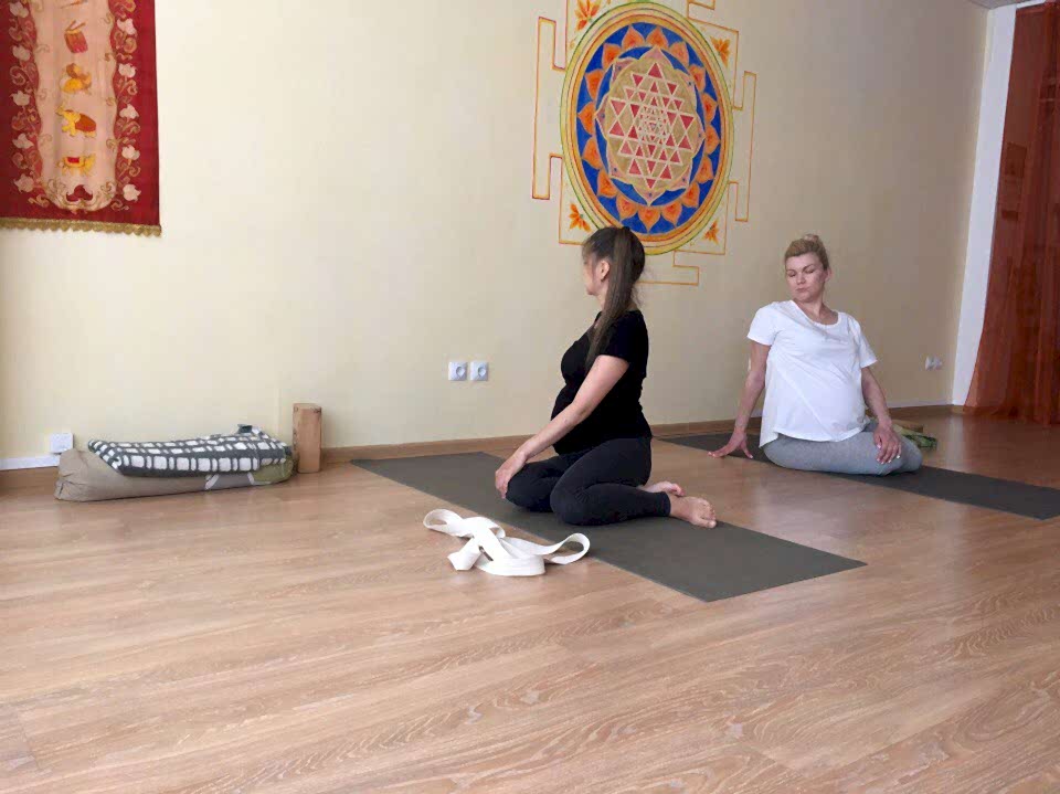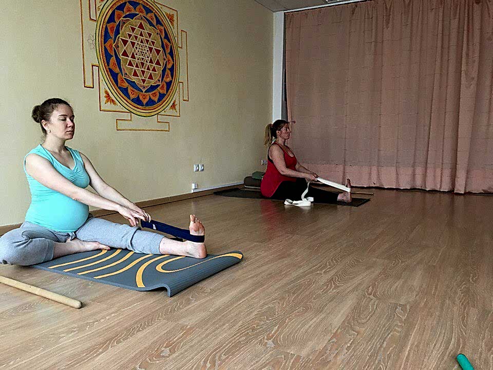 На занятиях пропеваем Мантру, звуки, вибрация которой оказывают очень благоприятное влияние как во время беременности, так и в родах,