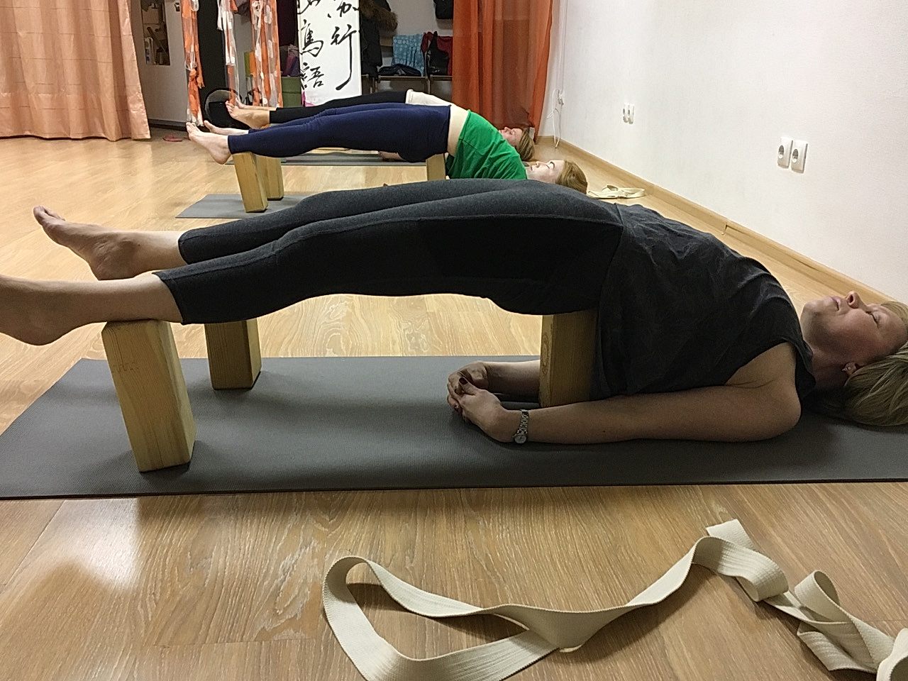 Для Pin-Up выполнения используется дополнительное оборудование: кирпичи для йоги, ремни, болстеры, ролы для пилатеса, мычи для проработки зажимов.
